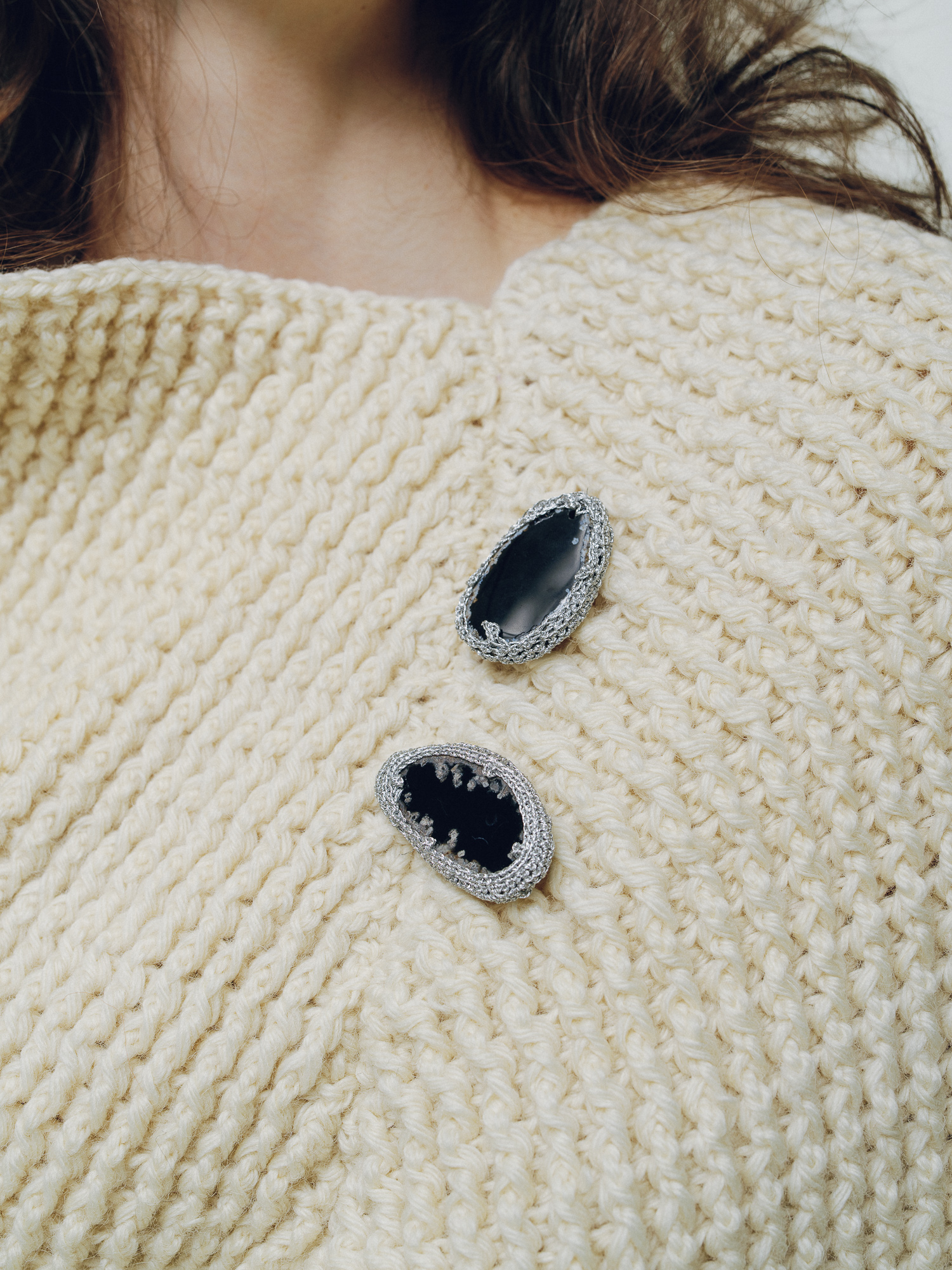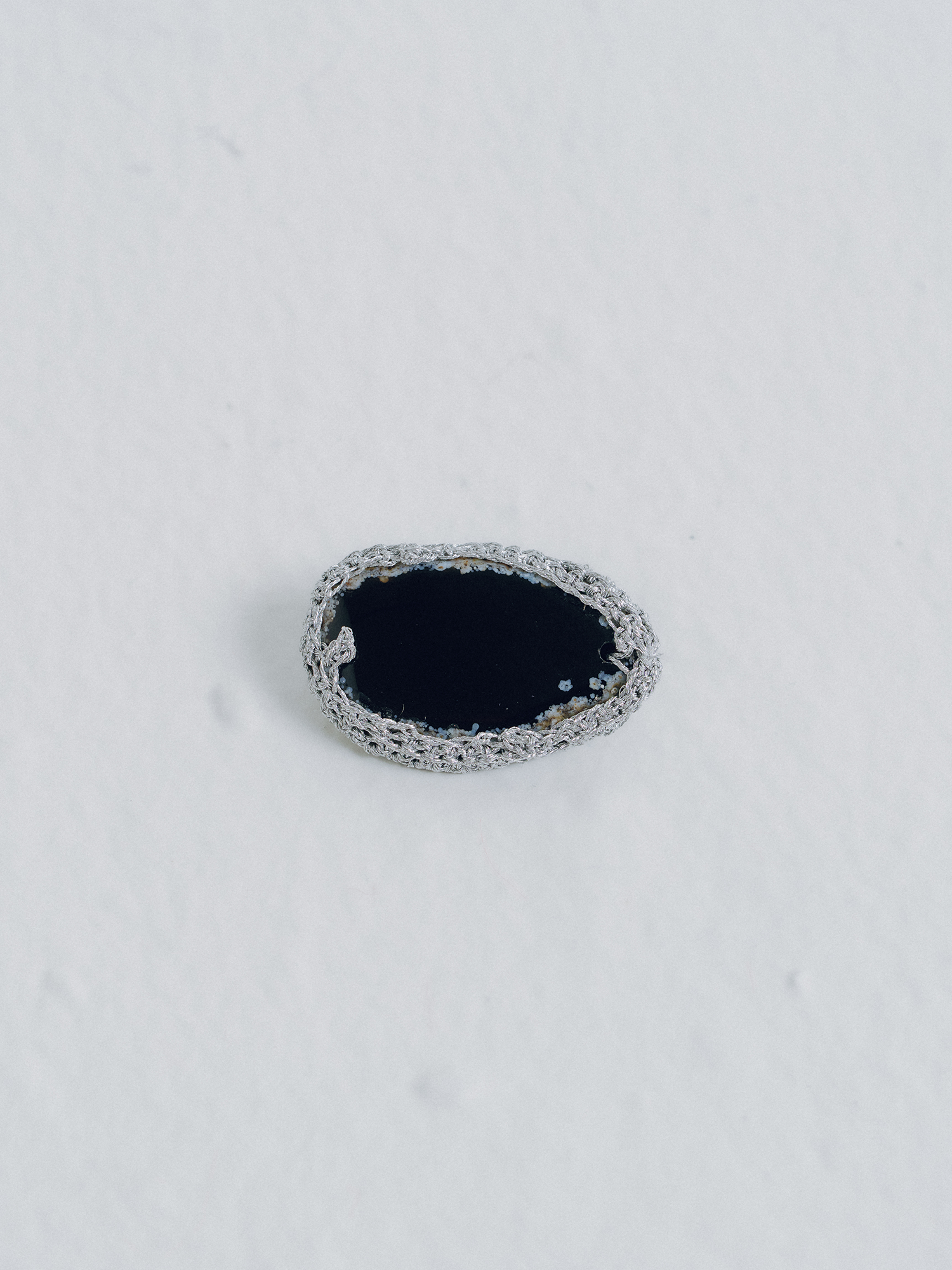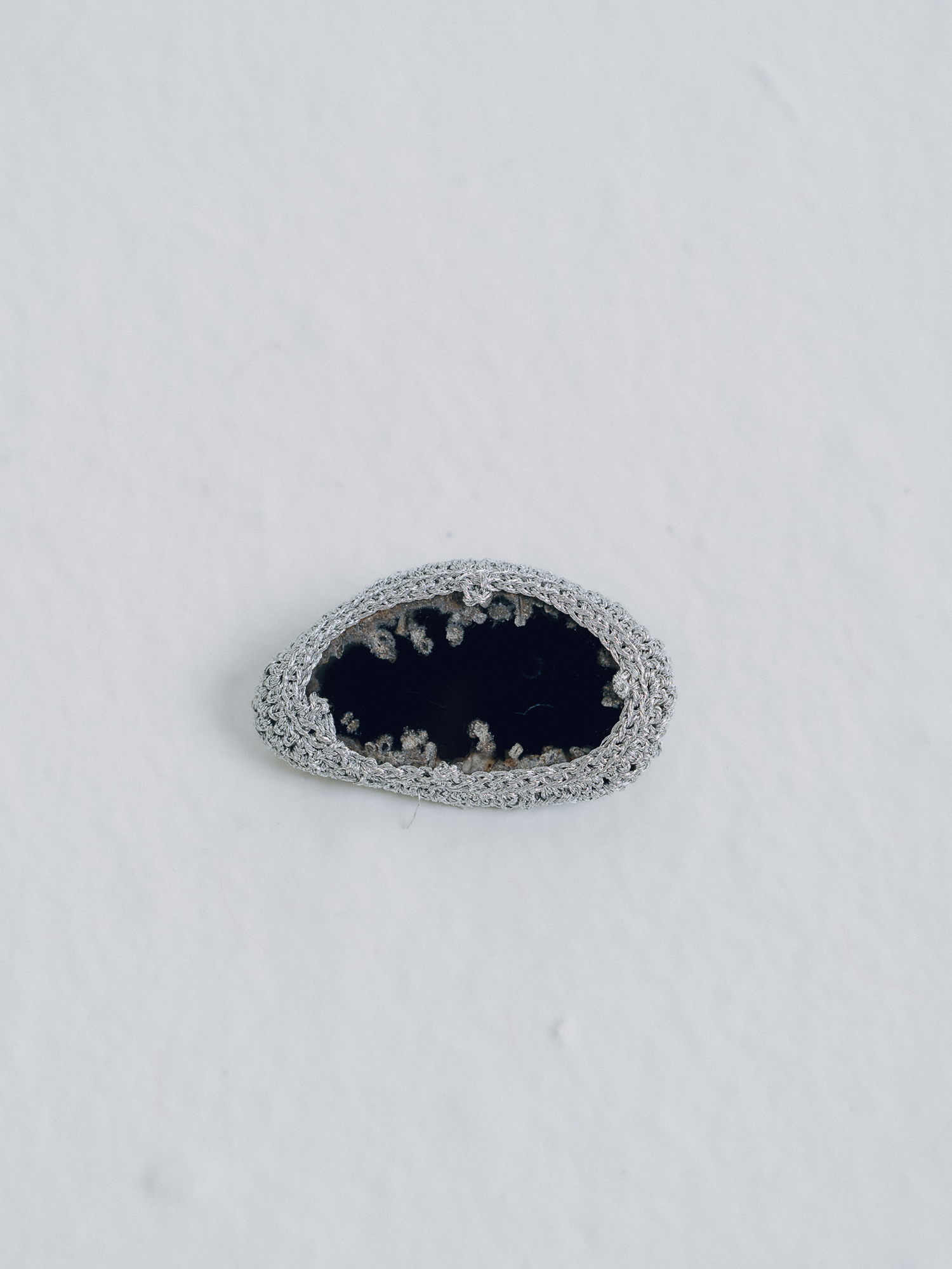 The contrast between soft crochet and the hardness of agate creates a unique tactile dialogue. Each piece is shaped according to the natural form of the stone, making every brooch one of a kind.