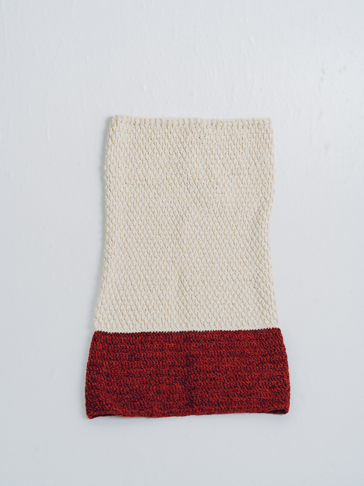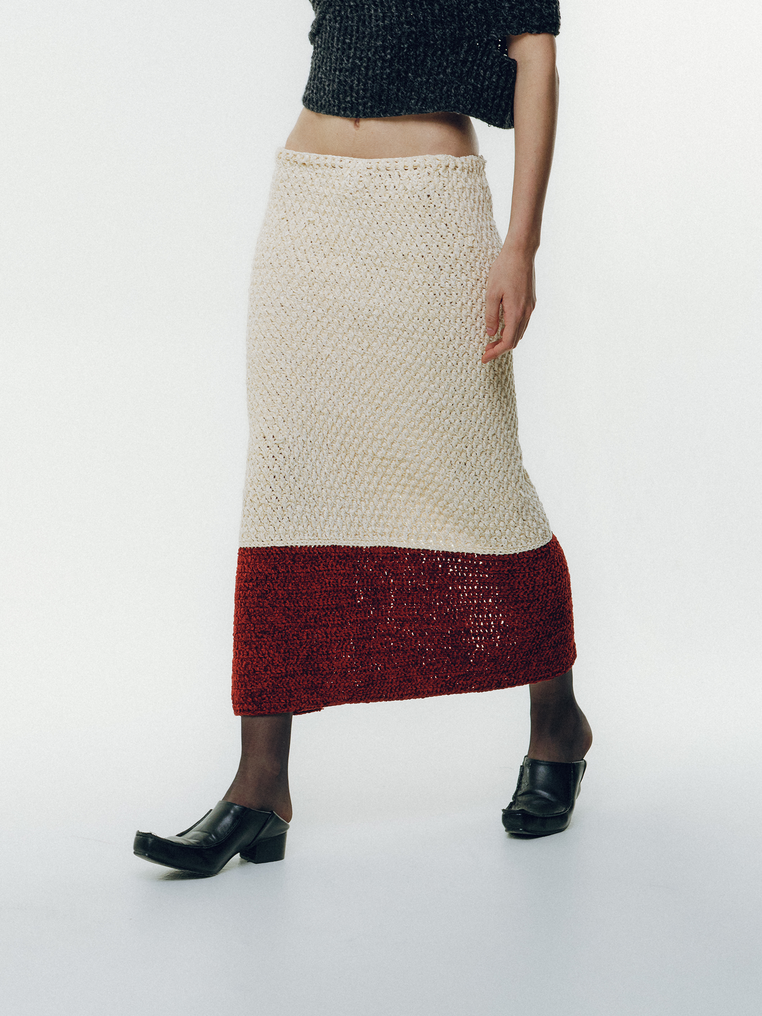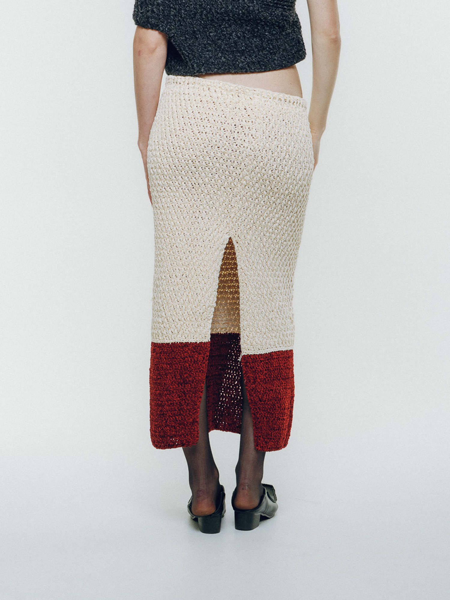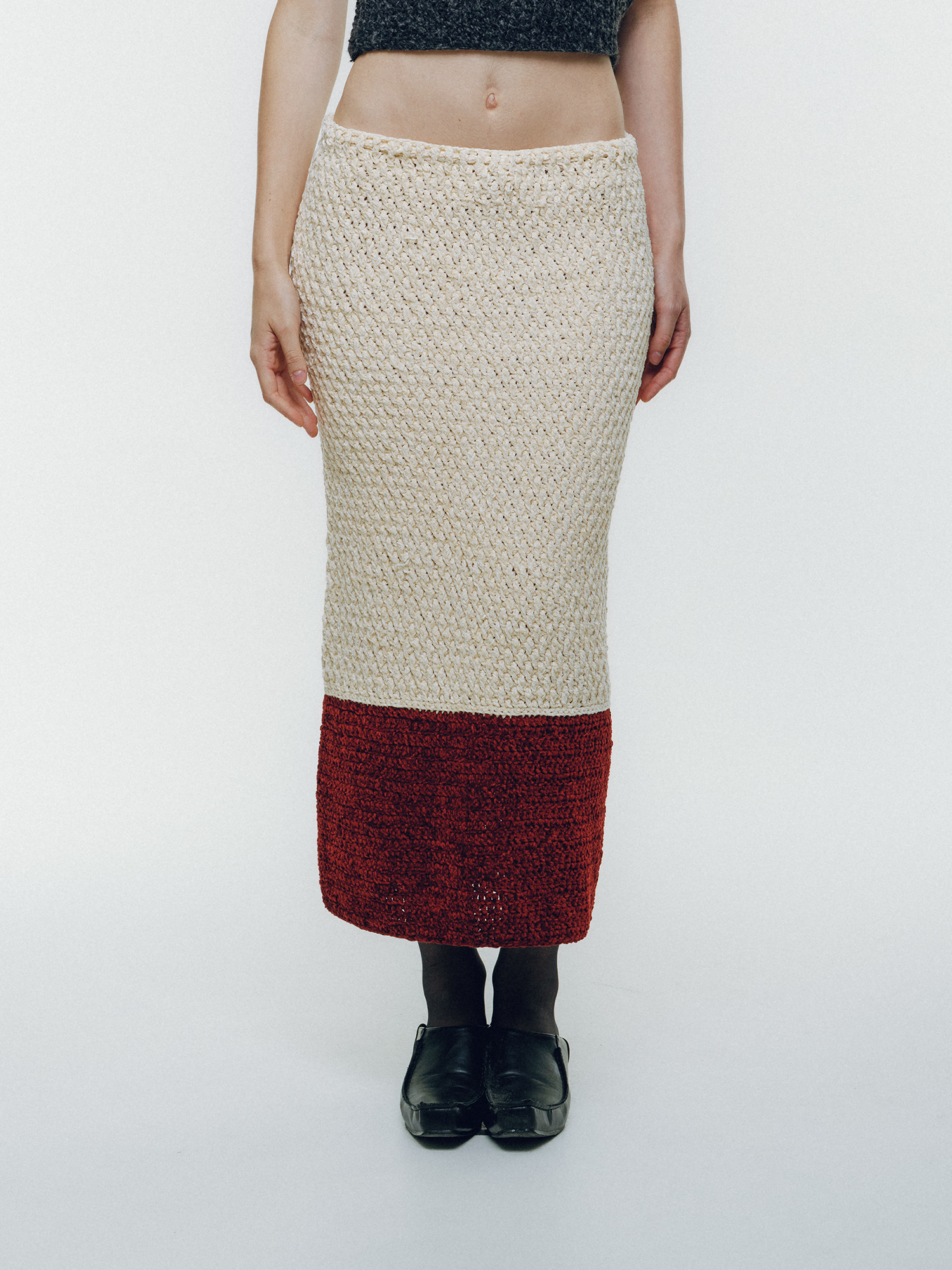 Hand-crocheted skirt featuring soft contrast panels in butter and date tones.