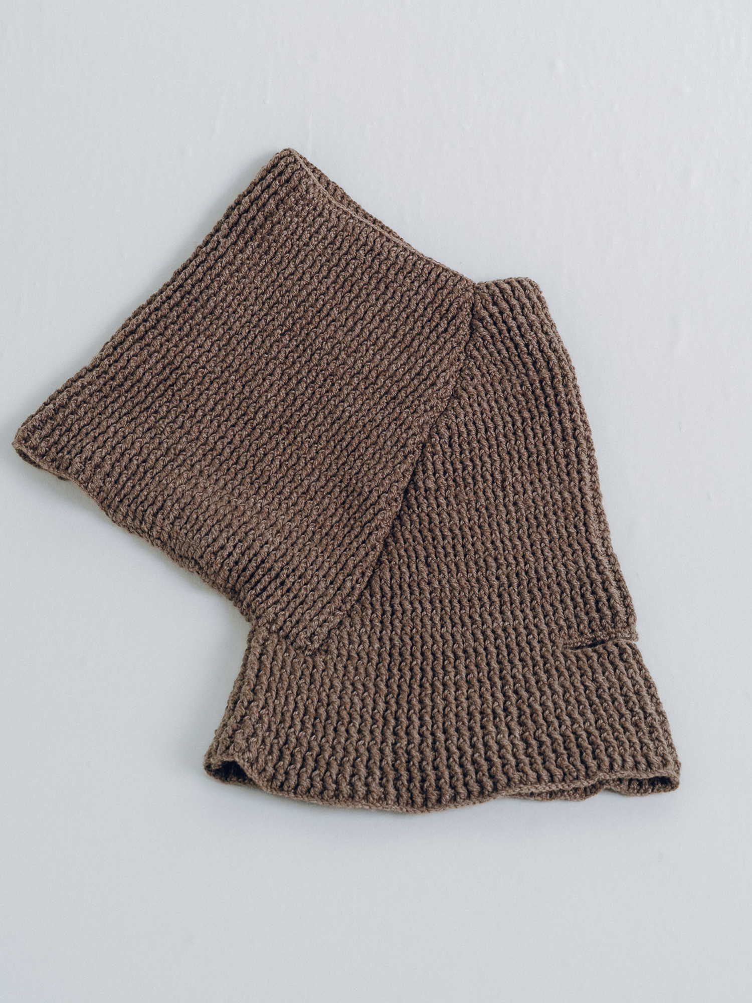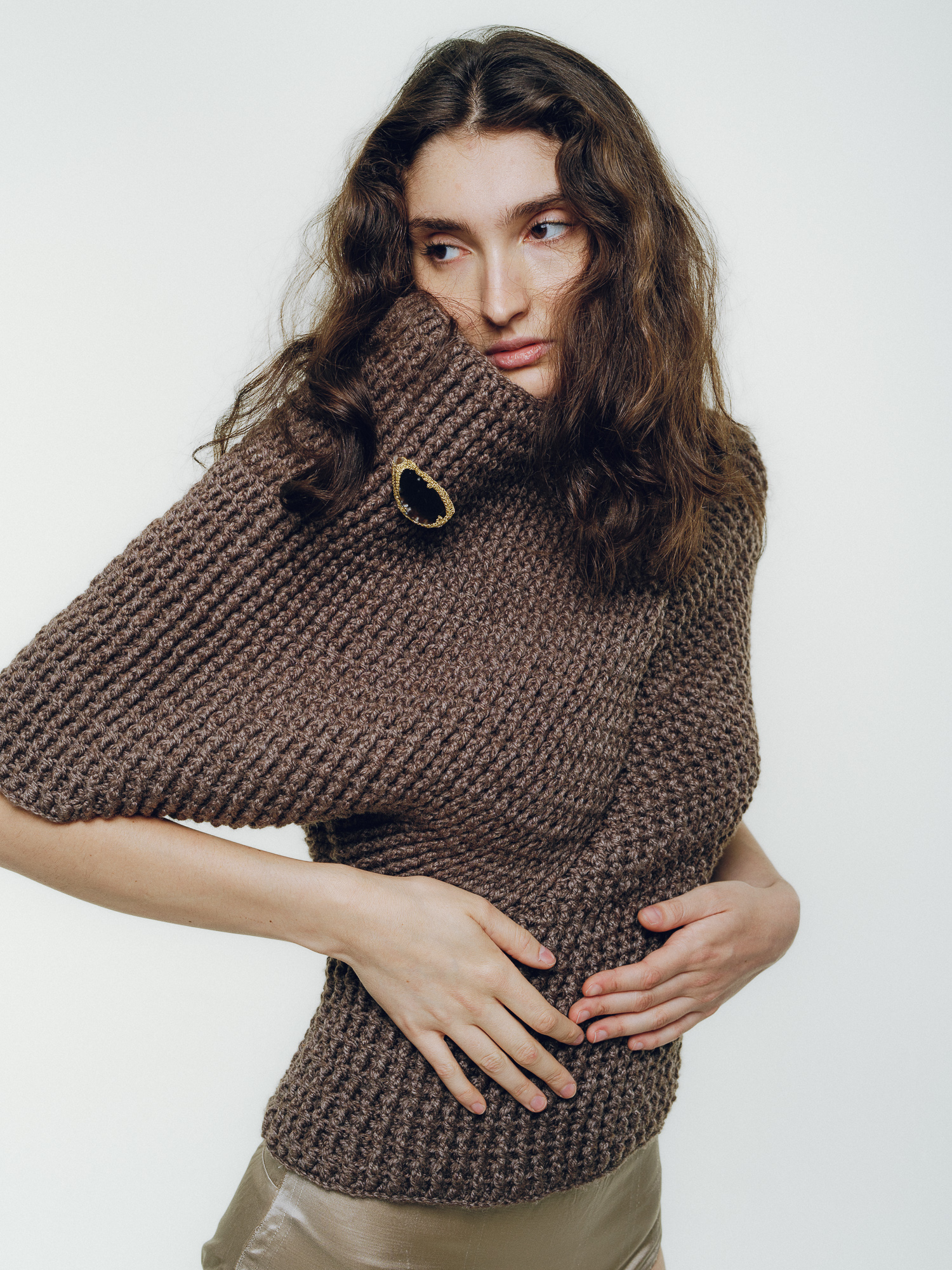 Hand-crocheted top in ash brown color with a dense, structured stitch. The heavier construction offers warmth and insulation while remaining soft and comfortable against the skin.