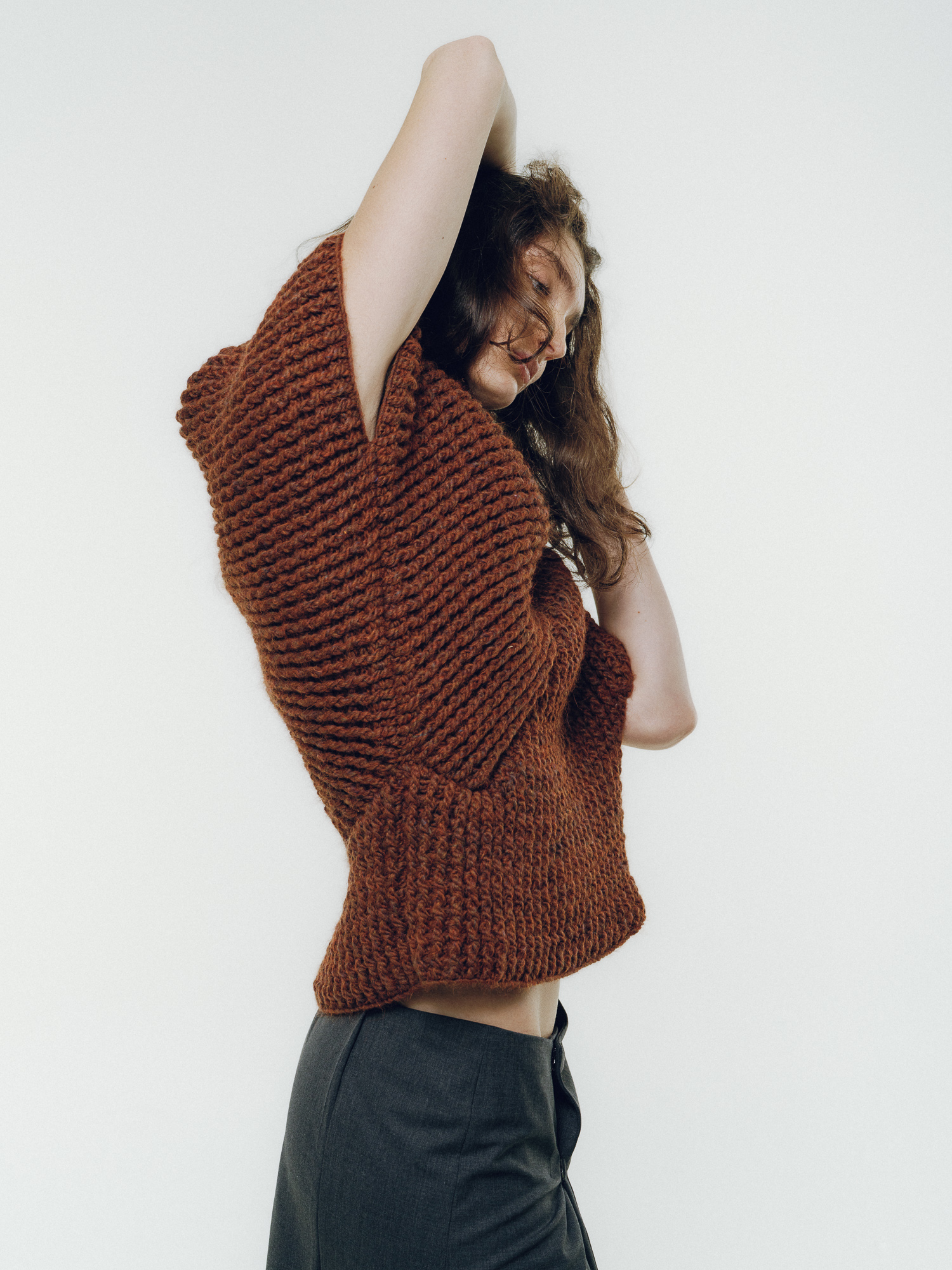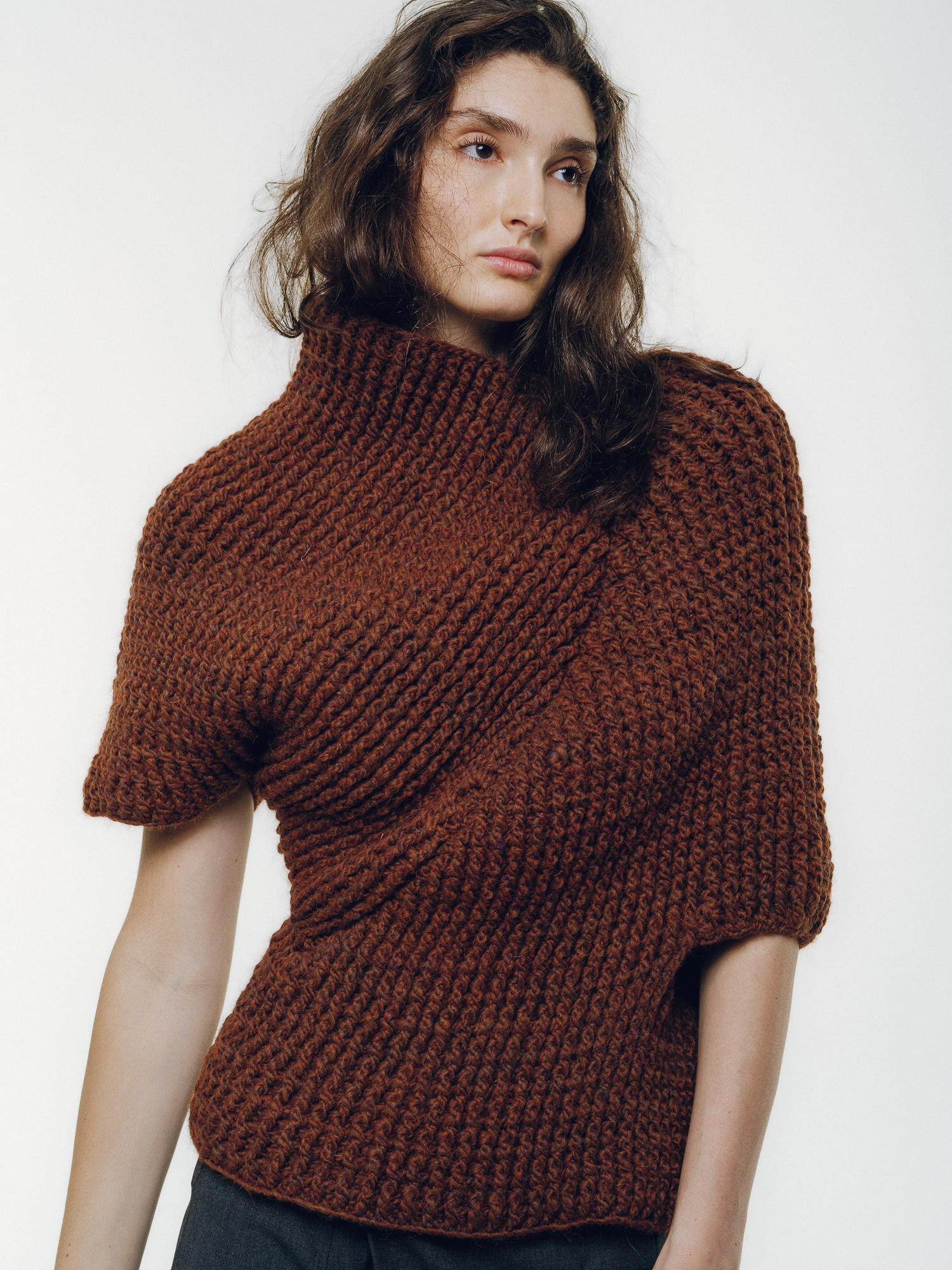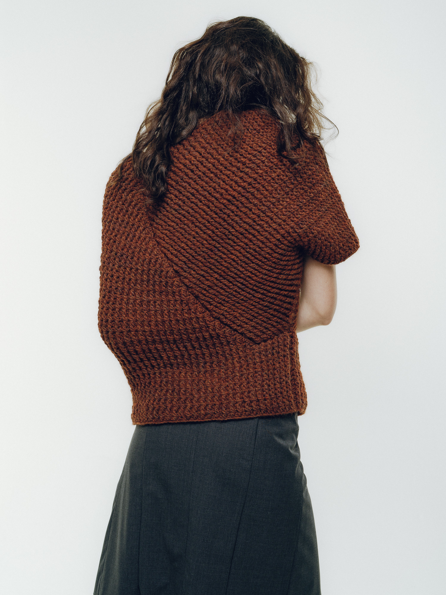 Structured crochet top in Chestnut with an asymmetrical cut.