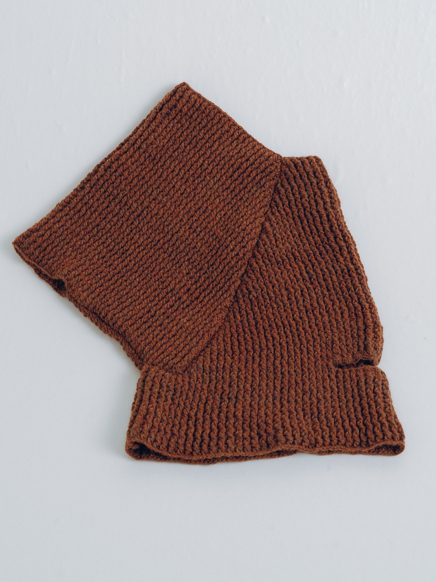 Hand-crocheted in a chunky stitch that creates volume and warmth, making it well-suited for cooler weather.