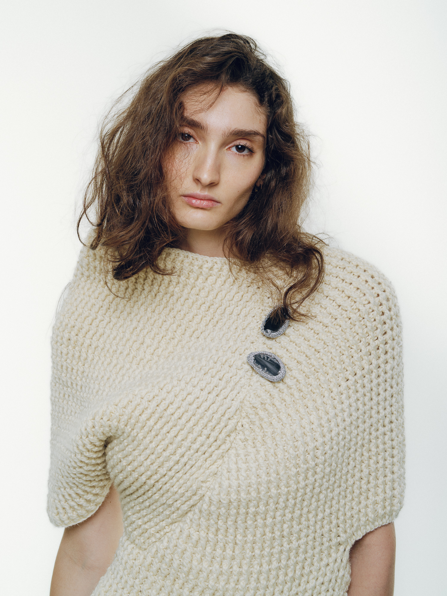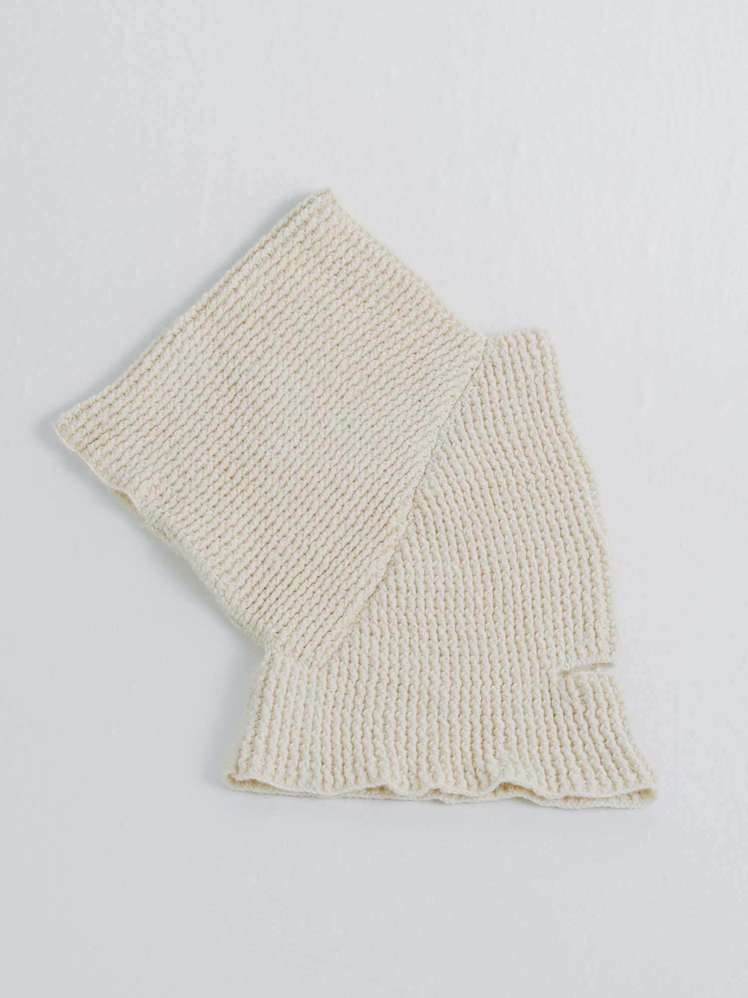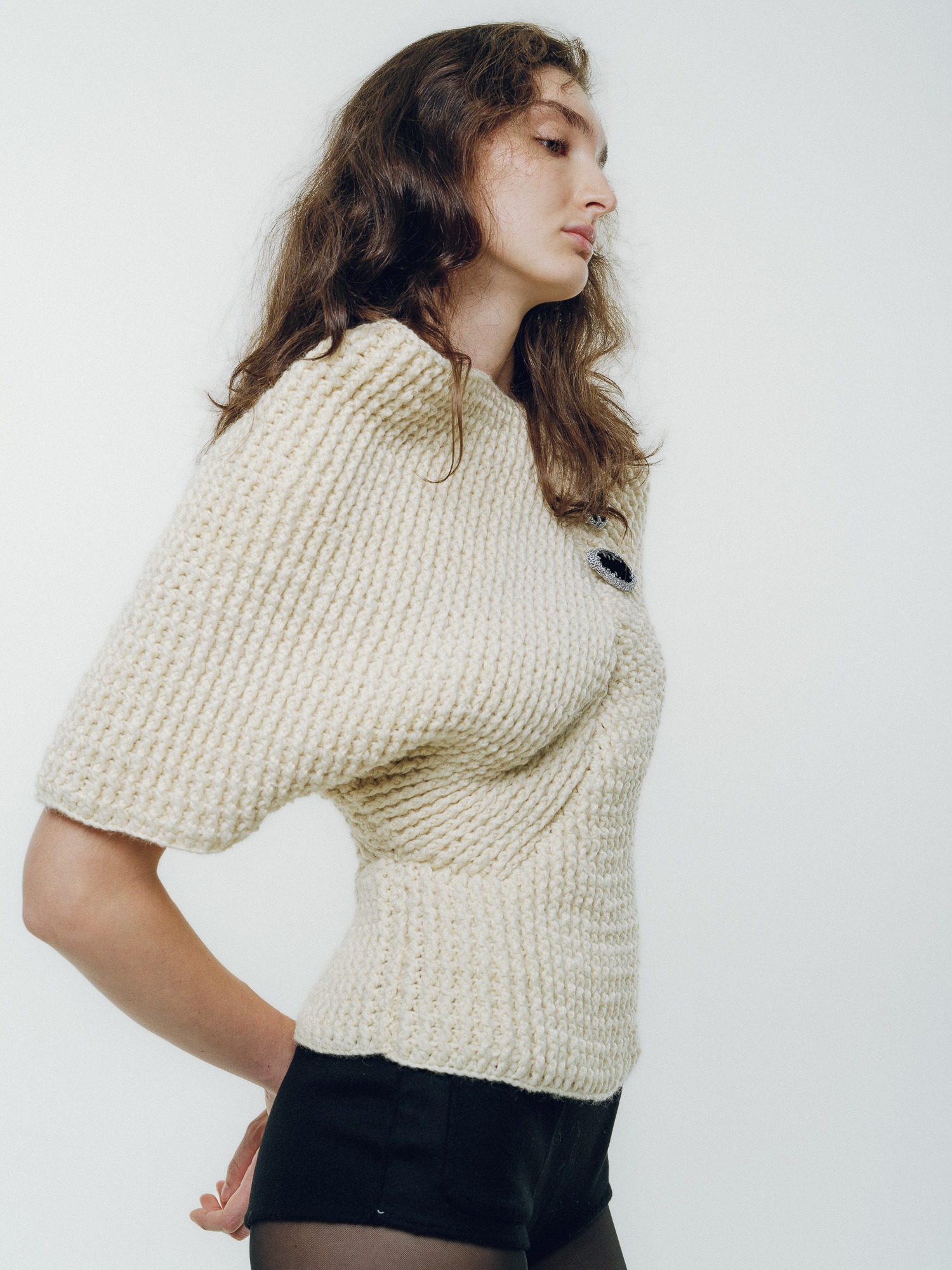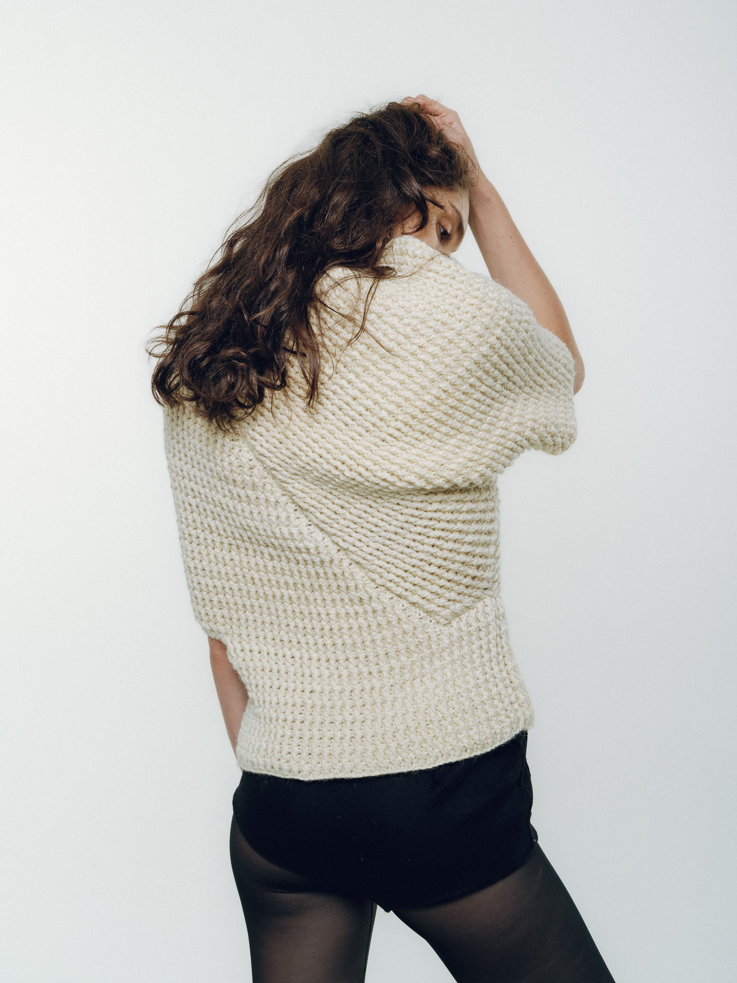 Hand-crocheted top in cream wool with an asymmetrical silhouette. The dense stitch structure gives volume and warmth while remaining comfortable against the skin.