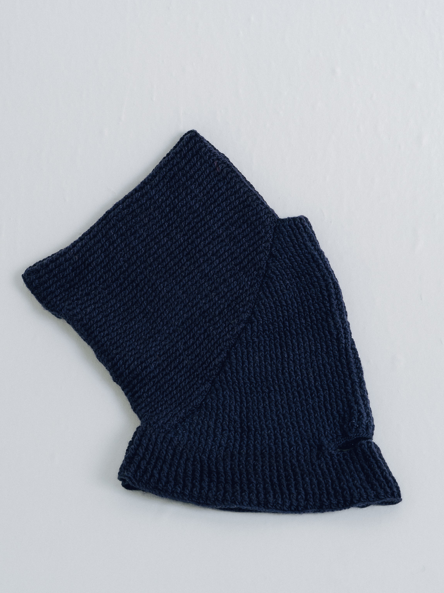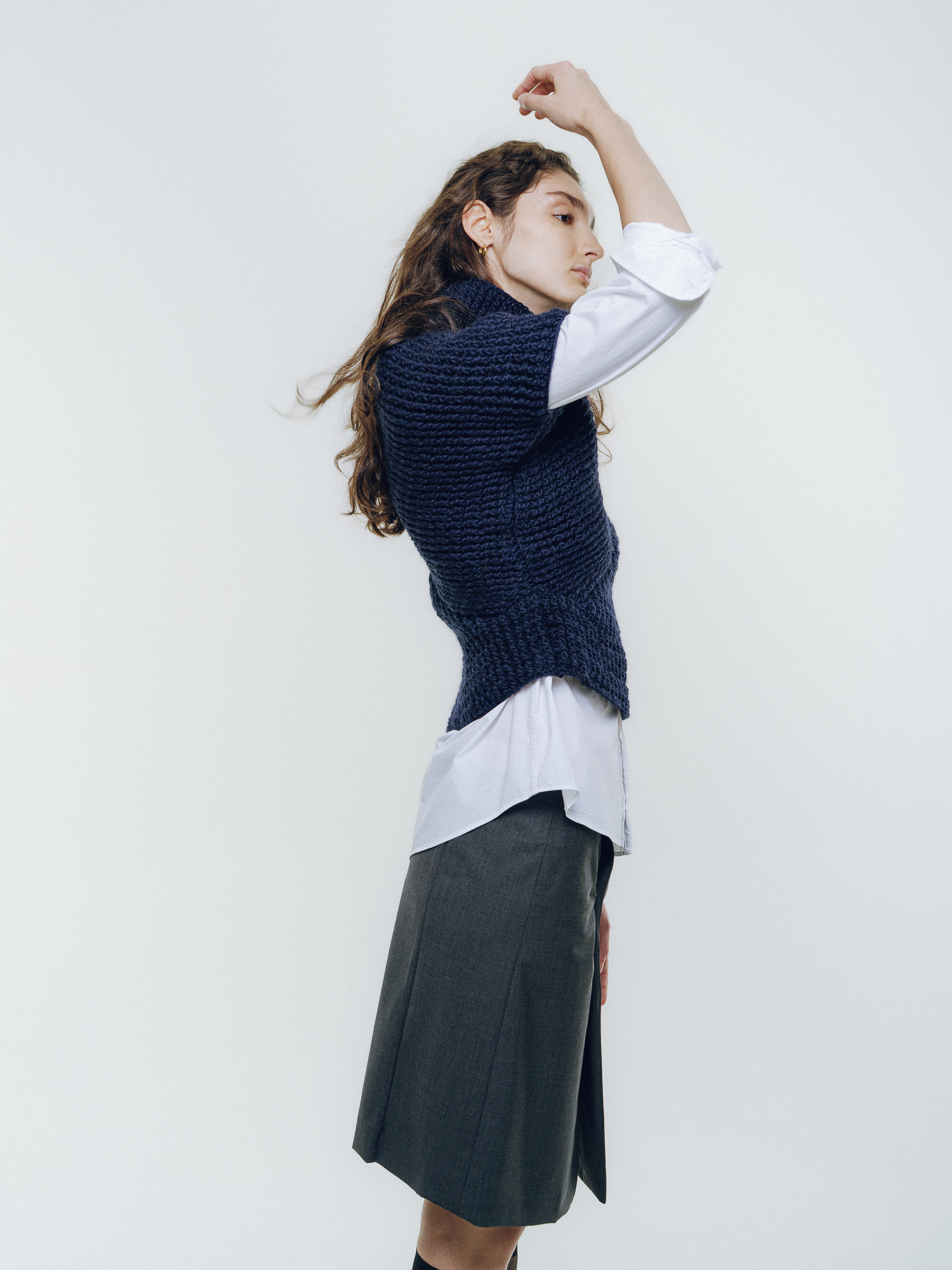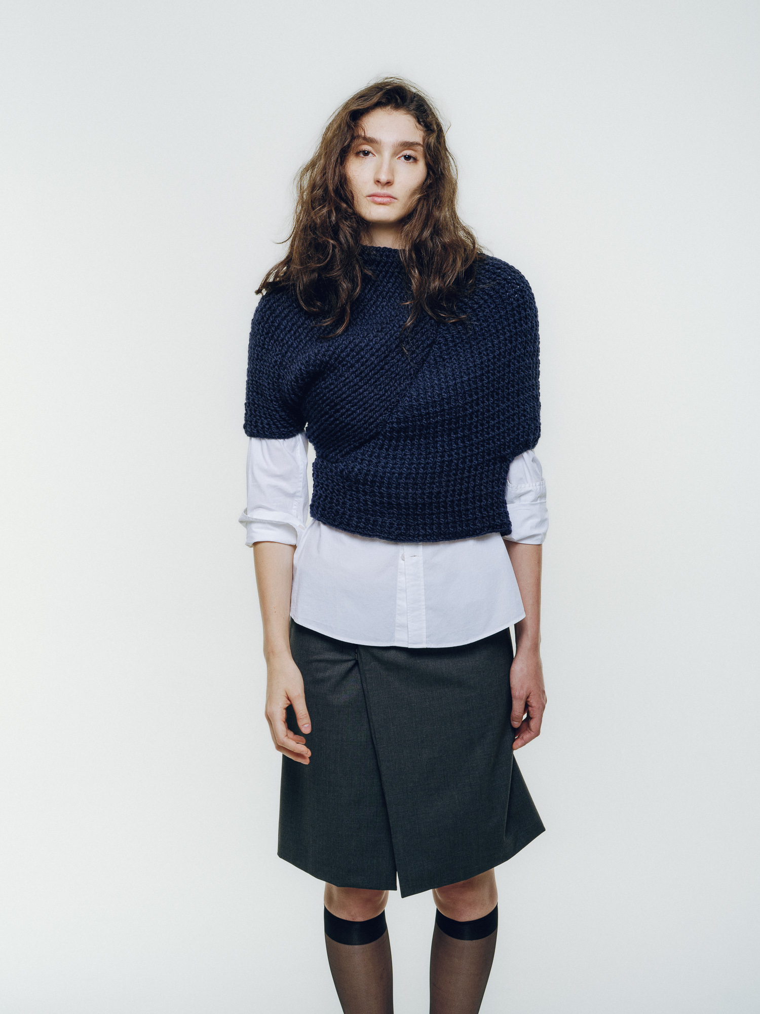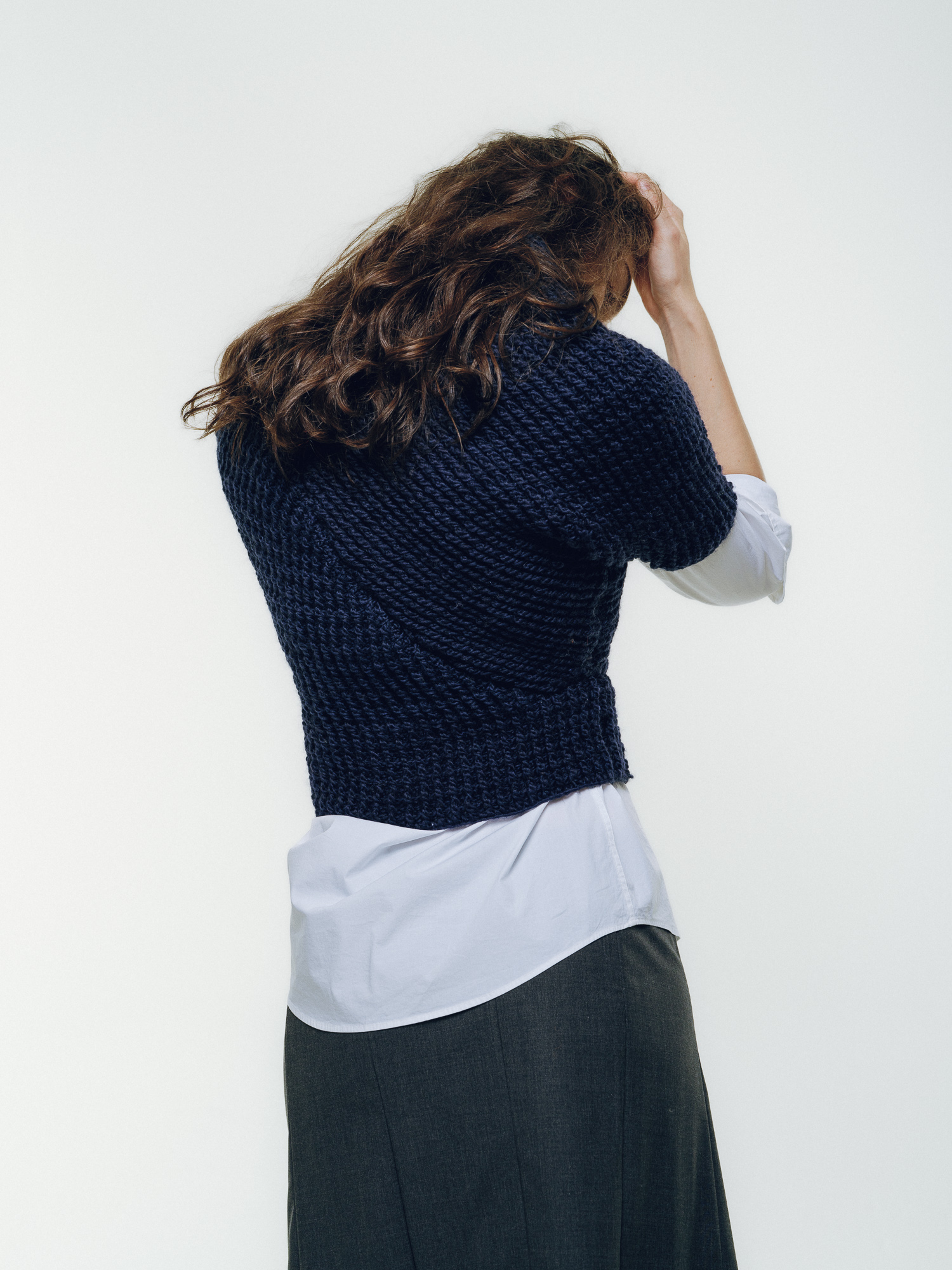 Hand-crocheted top in indigo with an asymmetrical cut. The dense crochet structure provides warmth and volume while remaining soft and non-irritating against the skin. Designed to hold shape while allowing ease and comfort.