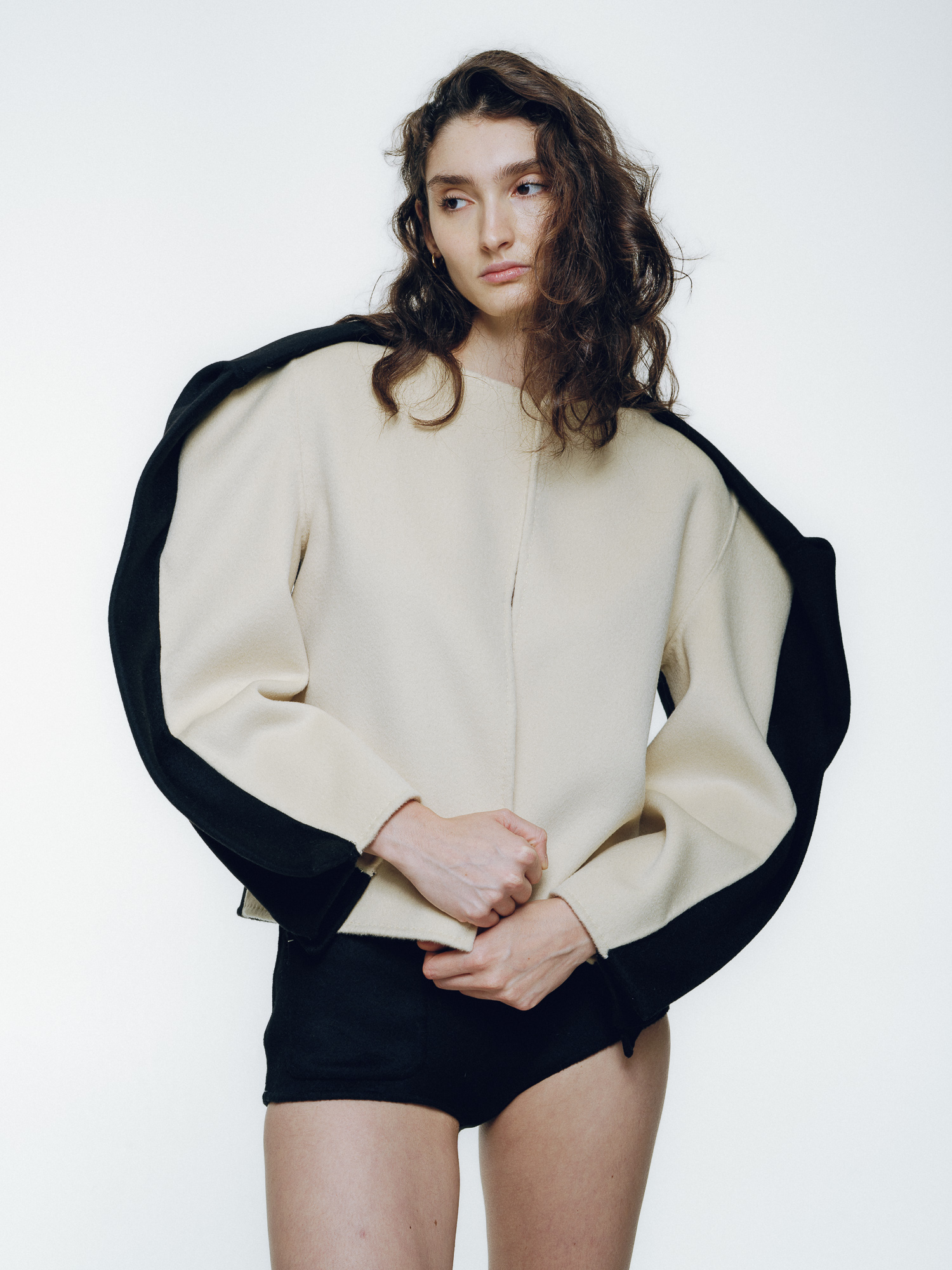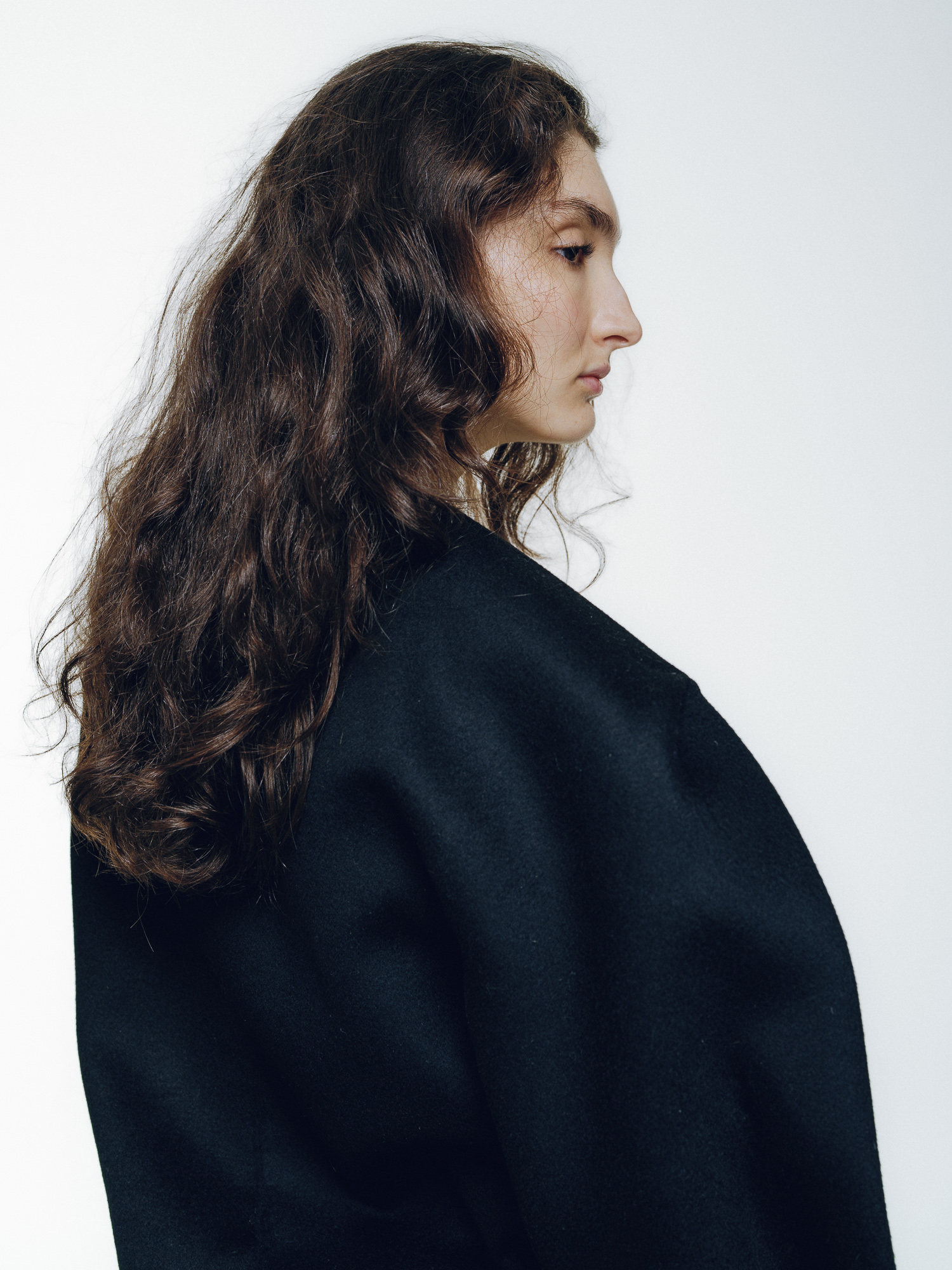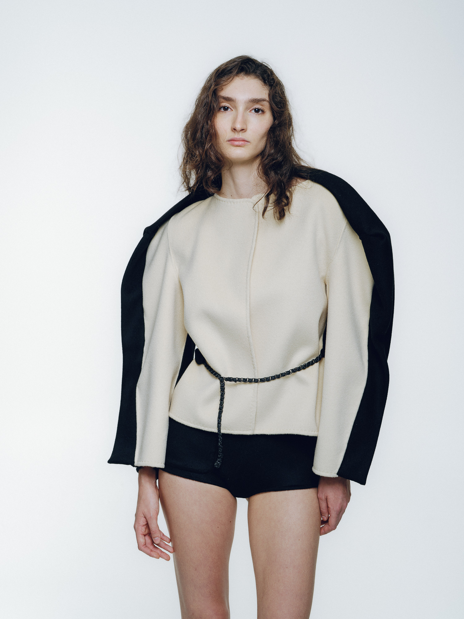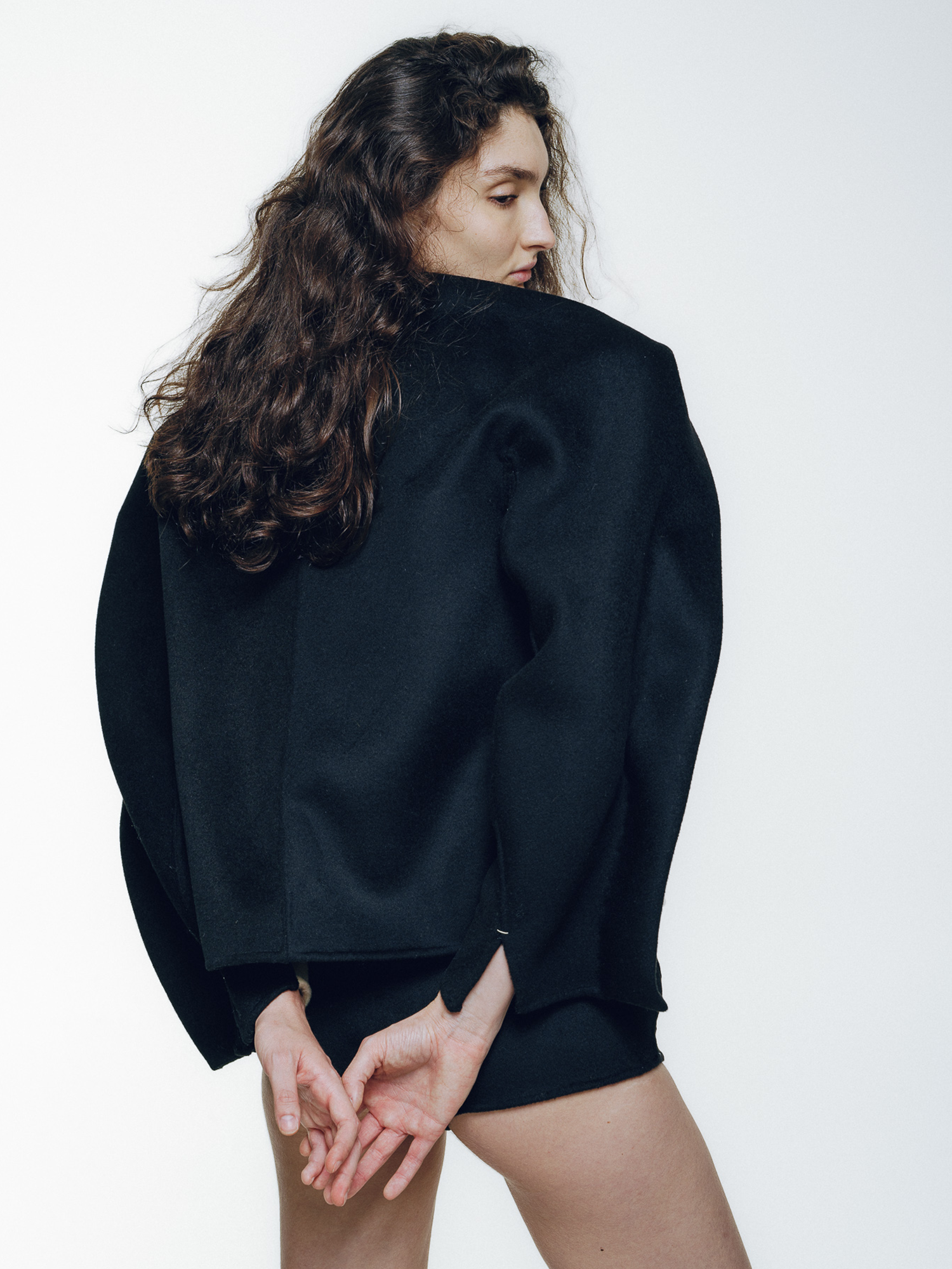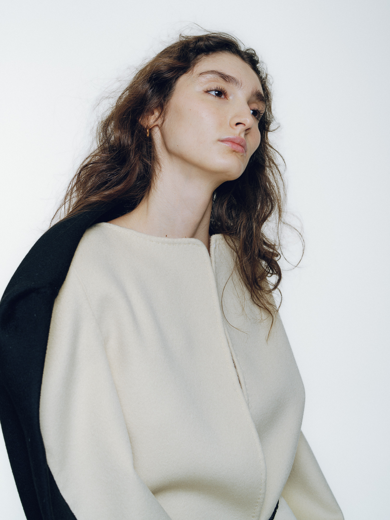 Handmade ensemble in double-faced wool–cashmere with a soft, buttery touch.